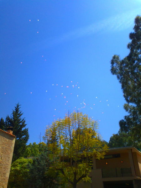 En la Masía de Ca Pareja en Canals, celebramos otra suelta de globos en la que Globos JC hinchó para la ocasión 150 globos con gas helio y con sus cintas.